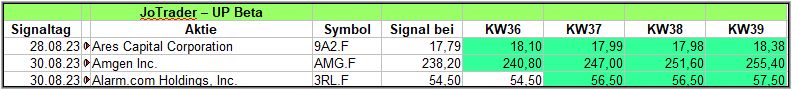 Nun kommen wir zum Update der vorigen Screener-Ergebnisse aus der KW35, KW36, KW37 und KW38, bezogen auf die Schlusskurse in KW39/23. KW34/23 fällt in dieser Woche weg.
