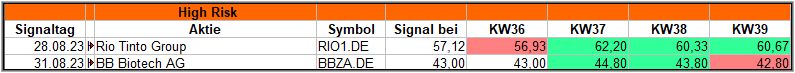 Die beiden vom High-Risk Screener generierten Signal hätten zumindest kurzzeitig leichte Gewinne erreicht, doch am Ende lag nur noch Rio Tinto im Plus und das obwohl Dividende ausgeschüttet wurde.
