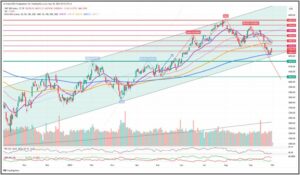 Sollte der Kurs im Bereich der 4.350$ scheitern und wieder nach unten drehen, droht ein erneuter Test des Kanals, wobei der Kurs bei einem Ausbruch abwärts, bis mindestens 4.000$ fallen könnte.
