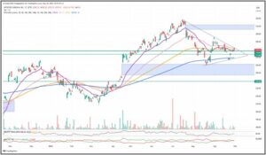 Der Kurs erreichte am 19.07.23 mit einem Tageshoch von 319€ sein letztes markantes Hoch. Anschließend gab der damals überkaufte Kurs deutlich nach und markierte nur einen Monat später, am 21.08.23das letzte Tief, mit einem Tagestief von 260€, das fast exakt auf eine Kurslücke vom 19. 04.23 aufsetzte.