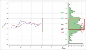 Das rote Rechteck markiert den relevantesten Bereich, der zwischen einer Wahrscheinlichkeit von 25% ins Plus und 25% ins Minus liegt. Die höchste Wahrscheinlichkeit für ein Kursziel liegt bei der höchsten Spitze innerhalb der Markierung