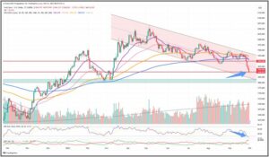 Solange der Kurs nicht ein höheres Hoch (> 1.950$) und höhere Tiefs erreicht, bleibt der fallende Trend bestehen und das könnte bei langanhaltend hohen Zinsen, noch eine Weile so weitergehen