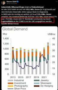 Der umrahmte Text scheint mir der wichtigste zu sein. Ja, die Bedarfe wurden durch Lagerbestände ausgeglichen und zwar problemlos. Wer sich an meine früheren Beiträge erinnert, hatte ich seit vielen Jahren darauf hingewiesen, dass die Silber-Lagerbestände in astronomische Höhen geklettert waren, nachdem die Industrie z.B. während den Lockdown, fast nichts mehr abgenommen hat.