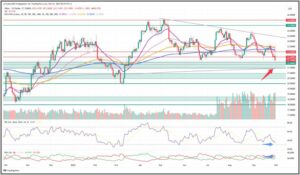 Der Kurs befindet sich in einem fallenden Dreieck, gebildet aus der fallenden grauen Linie und den verschiedenen Unterstützungslinien, die teils schon unterschritten wurden.