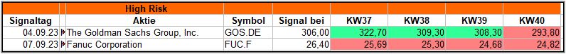 Diese Woche hatten wir nur 2 High-Risk Titel und die endeten beide im Minus. Hätte man bei Goldman Sachs aber schnell reagiert zu Beginn, hätte man einen schönen Gewinn einfahren können. Bei Fanuc blieb es von Anfang an bei einem Verlust. High Risk eben….
