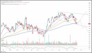 Im August hatte der Kurs ein Hoch von 34,31€ erreicht und bewegt sich schon länger, in einer Trompeten- oder Megaphonformation, auch Descending Broadening Wedge genannt.