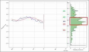 Das rote Rechteck markiert den relevantesten Bereich, der zwischen einer Wahrscheinlichkeit von 25% ins Plus und 25% ins Minus liegt. Die höchste Wahrscheinlichkeit für ein Kursziel liegt bei der höchsten Spitze innerhalb der Markierung