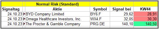 Nun kommen wir zum Update der vorigen Screener-Ergebnisse aus der KW40, KW41, KW42 und KW43/23, bezogen auf die Schlusskurse in KW44/23. KW39/23 fällt in dieser Woche weg.