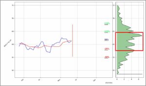 Das rote Rechteck markiert den relevantesten Bereich, der zwischen einer Wahrscheinlichkeit von 25% ins Plus und 25% ins Minus liegt. Die höchste Wahrscheinlichkeit für ein Kursziel liegt bei der höchsten Spitze innerhalb der Markierung
