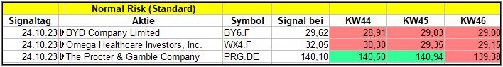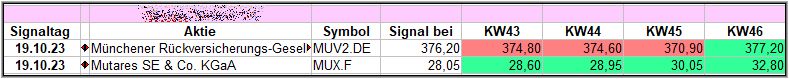 Nun kommen wir zum Update der vorigen Screener-Ergebnisse aus der KW42, KW43, KW44 und KW45/23, bezogen auf die Schlusskurse in KW46/23. KW41/23 fällt in dieser Woche weg.