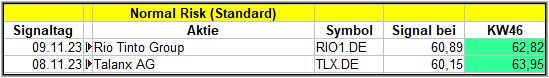Im Standard Screener wurden Signale für Talanx (Versicherer) und Rio Tinto (Bergbauunternehmen) generiert. Ob die beiden „bestehen“ werden, müssen die nächsten 4 Wochen zeigen.