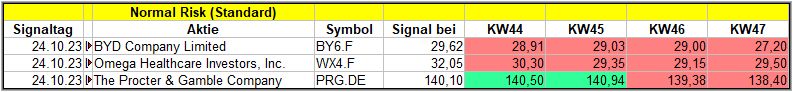 Nun kommen wir zum Update der vorigen Screener-Ergebnisse aus der KW43, KW44, KW45 und KW46/23, bezogen auf die Schlusskurse in KW47/23. KW42/23 fällt in dieser Woche weg.
