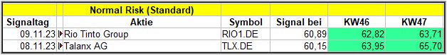 Im Standard Screener wurden Signale für Talanx (Versicherer) und Rio Tinto (Bergbauunternehmen) generiert. Ob die beiden „bestehen“ werden, müssen die nächsten 4 Wochen zeigen.