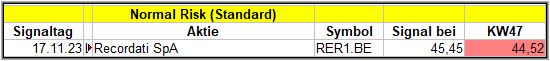 Immerhin gab es neben mehreren High – Risk Signalen, mit Recordati SpA auch ein Signal im Standard-Screener und mal sehen, was in den nächsten Wochen daraus wird.