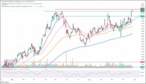 Aktuell läuft der Kurs in einem stabilen Trend nach oben, das man unschwer daran erkennen kann, dass die betrachteten Tagelinien EMA20 (Lila), EMA50 (Pink), EMA100(Orange) und EMA200 (blau)) in der entsprechenden Reihenfolge angeordnet, nach oben laufen.