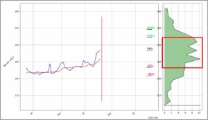 Das rote Rechteck markiert den relevantesten Bereich, der zwischen einer Wahrscheinlichkeit von 25% ins Plus und 25% ins Minus liegt. Die höchste Wahrscheinlichkeit für ein Kursziel liegt bei der höchsten Spitze innerhalb der Markierung