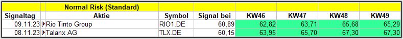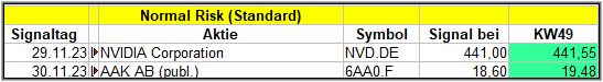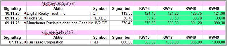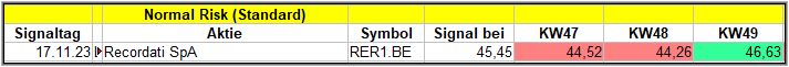 Nun kommen wir zum Update der vorigen Screener-Ergebnisse aus der KW45, KW46, KW47 und KW48/23, bezogen auf die Schlusskurse in KW49/23. KW44/23 fällt in dieser Woche weg.