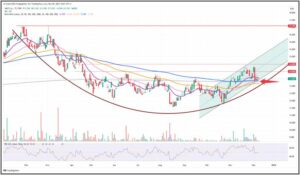 Der Kurs hat den MA (rot) am 02.12.23 unterschritten und steuert von unten kommend, aktuell auf einen möglichen Ausbruch über den MA zu.