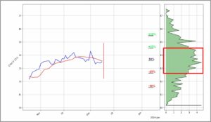 Das rote Rechteck markiert den relevantesten Bereich, der zwischen einer Wahrscheinlichkeit von 25% ins Plus und 25% ins Minus liegt. Die höchste Wahrscheinlichkeit für ein Kursziel liegt bei der höchsten Spitze innerhalb der Markierung