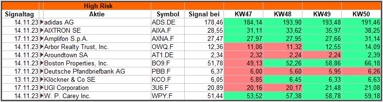 Ein Blick auf die Signale aus meinen High-Risk-Screener, die während den 4 Wochen nach dem jeweiligen Signal, sehr schön performt haben.