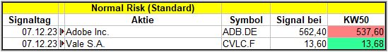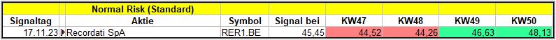 Nun kommen wir zum Update der vorigen Screener-Ergebnisse aus der KW46, KW47, KW48 und KW49/23, bezogen auf die Schlusskurse in KW50/23. KW45/23 fällt in dieser Woche weg.