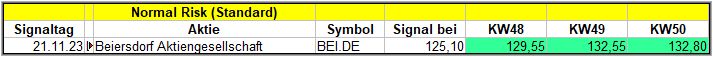 Die Aktie von Beiersdorf konnte auch in der 3. Woche nach dem Signal, erneut leicht zulegen und bereitet mit einem Anstieg von rund 7€/Aktie, bereits jetzt Freude. ![]()
