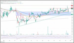 Der Kurs hat den MA (rot) am 13.12.23 unterschritten und steuert von unten kommend, aktuell auf einen möglichen Ausbruch über den MA zu, was bullisch wäre.