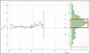Das rote Rechteck markiert den relevantesten Bereich, der zwischen einer Wahrscheinlichkeit von 25% ins Plus und 25% ins Minus liegt. Die höchste Wahrscheinlichkeit für ein Kursziel liegt bei der höchsten Spitze innerhalb der Markierung