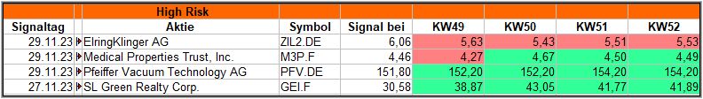 Die 4 Signale im High-Risk Screener haben sich im Plus gehalten, nur die Aktie von Elring-Klinger lag durchweg im Minus.