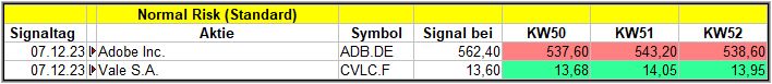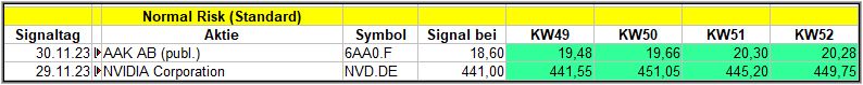 Nun kommen wir zum Update der vorigen Screener-Ergebnisse aus der KW48, KW49, KW50 und KW51/23, bezogen auf die Schlusskurse in KW52/23. KW47/23 fällt in dieser Woche weg.