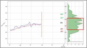 Achtung es handelt sich NICHT um eine Marktvolumenanzeige, sondern um eine mathematische Prognose. Auf Basis der letzten 1000 Kurse ergibt sich für den Wert aktuell die rechnerisch höchste Wahrscheinlichkeit im Bereich des eingezeichneten, roten Rechtecks, bzw. der höchsten Spitze innerhalb des Rechtecks.