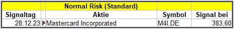 In dieser letzten Handelswoche 2023 lieferte der Screener, mit der Aktie von Mastercard Inc , nur 1 Signal im Standard Screener, so dass die Mitglieder der FB-Gruppe „Aktien Chart Check“ nicht zur Wahl gerufen wurden.![]()
