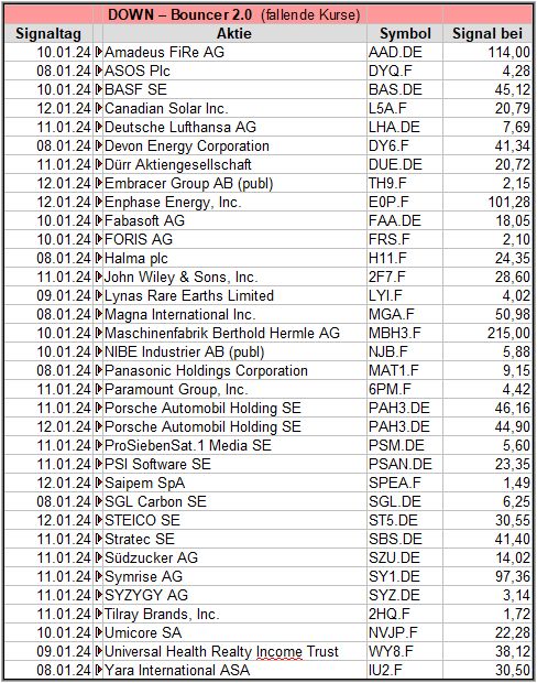 Dieser Screener setzt auf fallende Kurse und könnte, je nach Anzahl der Signale auch einen Rückschluss auf den Gesamtmarkt zulassen, der möglicherweise bärischer wird, wenn die „Down“ Signale überwiegen.