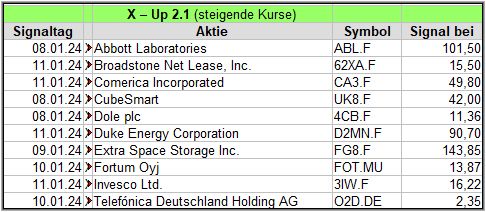 Dieser Screener setzt auf steigende Kurse und könnte auf einen neuen Trend nach oben hindeuten. Die Anzahl der Signale lässt auch einen Rückschluss auf den Gesamtmarkt zu, der möglicherweise bullischer wird, wenn „UP“ Signale überwiegen.
