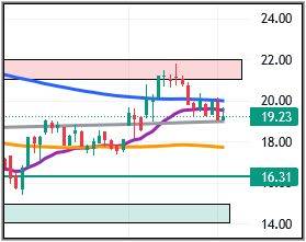 Zuletzt scheiterte der Kurs an der Widerstandszone bei 22€ und hat im nachfolgenden Rücklauf sowohl die SMA200 (blau) bei 19,98€, als auch die EMA20 (lila) bei 19,53€. unterschritten. Anschließend konnte die extrem wichtige 200 Wochenlinie (18,98€) nur mit Mühe verteidigt werden, was ich links vergrößert darstelle. Die 200 Wochenlinie (grau) darf nicht unterschritten werden, sonst droht ein Rücksetzer auf die SMA100 (orange) bei 17,72€ und möglicherweise ein Absacker bis in den Bereich von 15,00 – 16,30€. Deshalb also die graue Linie im Auge behalten.