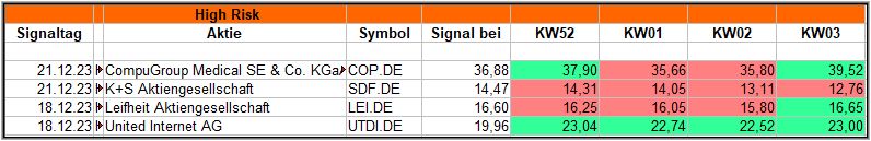 In dieser Woche gab es nur High-Risk-Signale, die sich aber im 4 Wichen Verlauf sehr schön geschlagen haben.