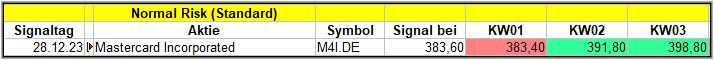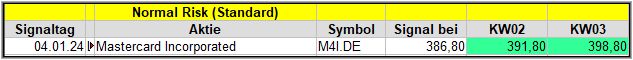Mit Mastercard gab es erneut nur ein einziges Signal im Standard-Screener und das hatten wir auch schon in der KW52/23. Das kann bei eher seitwärts laufenden Kurse schon mal vorkommen, dass sie sozusagen um den Signalpunkt oszillieren und so immer wieder das gleiche Signal auslösen, ohne sich wirklich absetzen zu können.