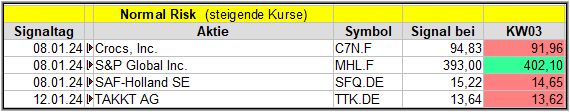 Nun kommen wir zum Update der vorigen Screener-Ergebnisse aus der KW51, KW52/23, KW01/24 und KW02, bezogen auf die Schlusskurse in KW03/24. KW50/23 fällt in dieser Woche weg.
