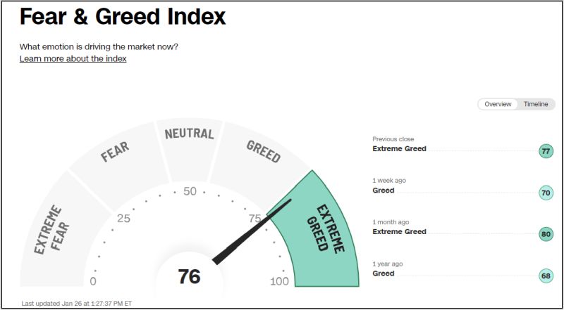 Der Fear & Greed Index liegt im unteren Bereich extremer Gier und sollte der S&P500 jetzt nicht konsolidieren, sondern über die 4.900$ davonziehen, wird sich die Situation hier weiter verschärfen und es könnte brandgefährlich werden.