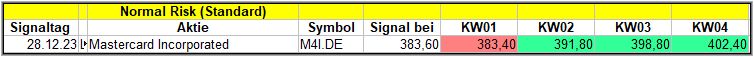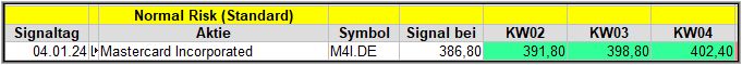 Mit Mastercard gab es erneut nur ein einziges Signal im Standard-Screener und das hatten wir auch schon in der KW52/23. Das kann bei eher seitwärts laufenden Kurse schon mal vorkommen, dass sie sozusagen um den Signalpunkt oszillieren und so immer wieder das gleiche Signal auslösen, ohne sich wirklich absetzen zu können.