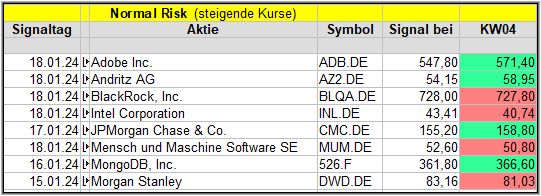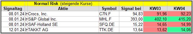 Nun kommen wir zum Update der vorigen Screener-Ergebnisse aus der KW52/23, KW01/24, KW02/24 und KW03/24, bezogen auf die Schlusskurse in KW04/24. KW51/23 fällt in dieser Woche weg.