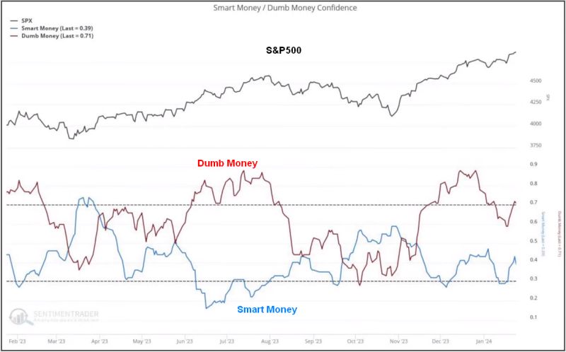 Beim Verlauf von Smart- zu Dumb-Money, hat das Smart-Money diese Woche, auf niederem Niveau zugelegt , während das Dumb-Money schon wieder im kritischen hohen Bereich liegt.
