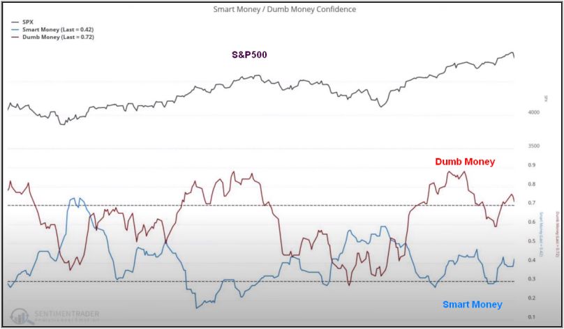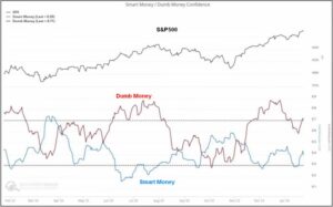 Hier hat sich der Verlauf nur leicht geändert, aber man kann gut erkennen, wie das Dumb Money aus dem Markt gegangen ist während der letzten Tage und Smart Money fast in gleicher Höhe eingestiegen ist, also die Verkäufe eingesammelt hat.