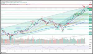 Sinnvoll wäre ein Rücklauf auf max. 4.800$, damit der Anstieg fortgesetzt werden kann. Ein „Ass im Ärmel“ des S&P500 sind die vielen zurückgebliebenen Werte, die bisher den 7 großen Techwerten nicht annähern gefolgt sind, auf dem Weg nach oben. Sollte der breite Markt also ansteigen, wäre ein gleichzeitiger Rücksetzer der „Magnificent 7“ (eigentlich ein dämlicher Ausdruck) kompensierbar, es sei denn dieser löst eine allgemeine Panik unter den Anlegern aus, die dann womöglich wieder gleich alles rauswerfen. Psychopatische Börsen sind unberechenbar….aber man kann sie einkalkulieren
