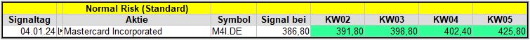 Mit Mastercard gab es erneut nur ein einziges Signal im Standard-Screener und das hatten wir auch schon in der KW52/23. Das kann bei eher seitwärts laufenden Kurse schon mal vorkommen, dass sie sozusagen um den Signalpunkt oszillieren und so immer wieder das gleiche Signal auslösen, ohne sich wirklich absetzen zu können.