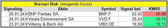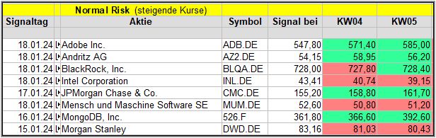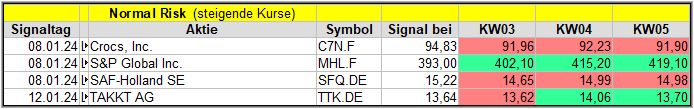 Nun kommen wir zum Update der vorigen Screener-Ergebnisse aus der KW01/24, KW02, KW03 und KW04, bezogen auf die Schlusskurse in KW05/24. KW52/23 fällt in dieser Woche weg.