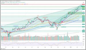 Am Montag darf man mit einem Test der 5.000$ und auf die Woche gesehen, auch mit einem (Fehl)Ausbruch, über die 5.000 hinaus rechnen. Ich gehe angesichts des dann vermutlich überhitzten S&P500, vorerst von einem nur kurzzeitigen Ausbruch aus, der in Gewinnmitnahmen mündet, die den Kurs gerne in den Bereich 4.900 -4.950$ nach unten bringen dürfen, um es anschließend erneut nach oben versuchen zu können. In verrückten Zeiten ist es natürlich sogar möglich, dass der Kurs über die 5.000$ ausbricht und darüber konsolidiert, um dann die 5.100$ anzugehen. Alles nicht unmöglich.