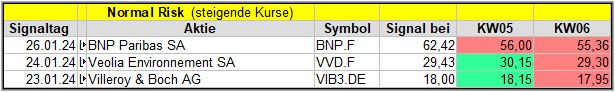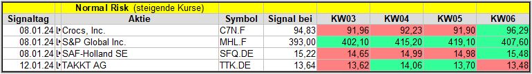 Nun kommen wir zum Update der vorigen Screener-Ergebnisse aus der KW02, KW03, KW04 und KW05, bezogen auf die Schlusskurse in KW06/24. KW01/24 fällt in dieser Woche weg.