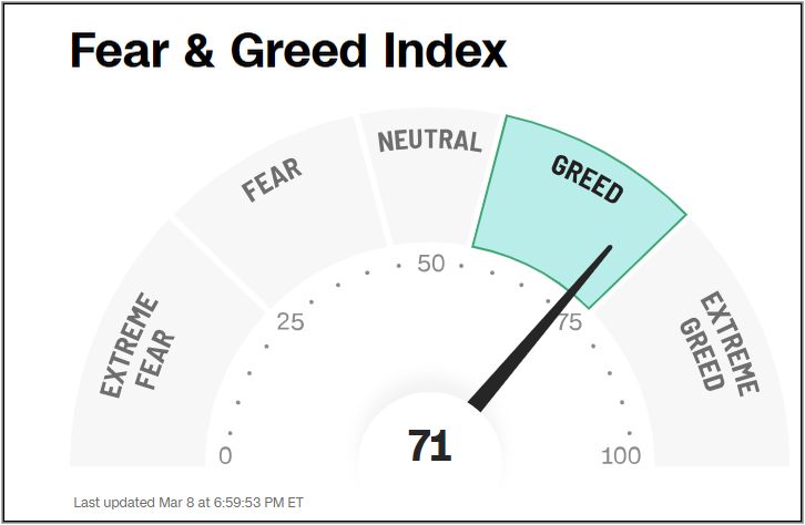 Der Fear & Greed Index liegt nun zum ersten Mal im „normalen“ Gier Bereich, nachdem er die letzten 3 Wochen durchweg „extreme Gier“ angezeigt hatte. Dies sit dem schwachen Freitag geschuldet, der die gesamten wochengewinne des S&P500 pulverisiert hat.
