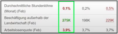 Nachfolgend die Arbeitsmarktdaten. Grün markiert das Ergebnis, danach die Veränderung und die letzte Spalte mit den Erwartungen. Die Stundenlöhne gaben nach, die Beschäftigung (NFP) nahm überraschen deutlich zu und die Arbeitslosenquote stieg an, was alles zusammengenommen negativ für die Aktienmärkte ist. Darum auch die fallenden Kurse am Freitag, nach einer kurzen Bedenkzeit, die üblich ist. ![]()